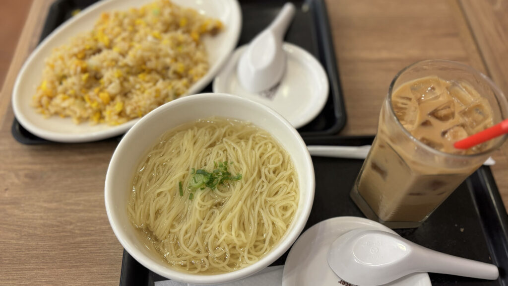 ミスドで「たまごチャーハン」605円と「汁そば」374円と「アイスカフェオレ」にしました。カフェオレはドリンクBセット(飲茶)になって234円。合計1,213円、結構行ったな。