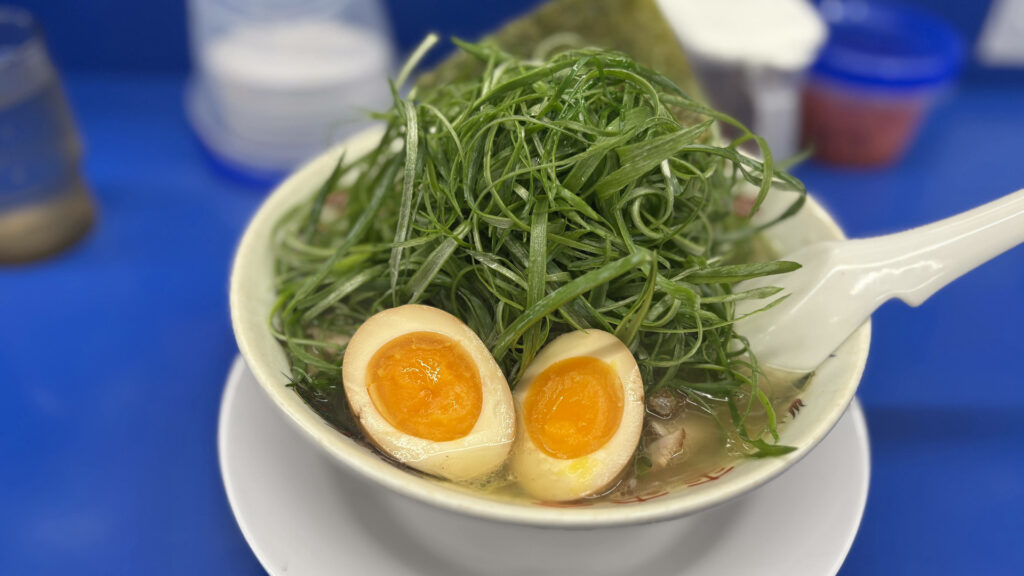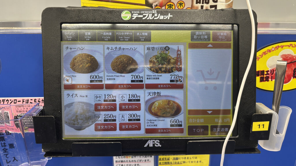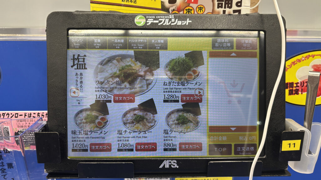 目の前のタッチパネルで注文。今回はねぎたま塩ラーメンで、ネギ多めにしました。後で考えると、普通の塩ラーメンで良かった。