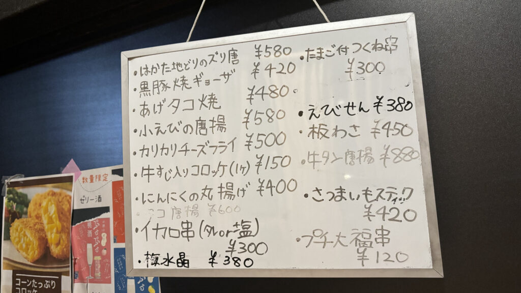 本日のおすすめ。この中からは黒豚焼ギョーザ、あげタコ焼、小えびの唐揚、梅水晶、えびせんを食べました。