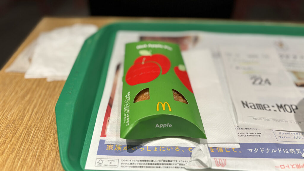 テーブルに座り、いつものようにモバイルオーダーでアイスカフェラテのLとホットアップルパイを注文。