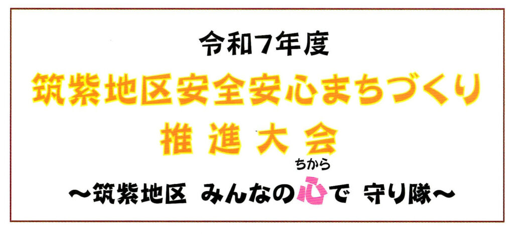 私たちは、一人ひとりが地域安全運動の担い手として、犯罪、少年非行、交通事故及び火災等を抑止するため、「筑紫地区 みんなの心(ちから)で 守り隊」を合言葉に、更に活動の輪を広げ、真に安全で安心な筑紫地区を実現するため、一層努力することを宣言します。