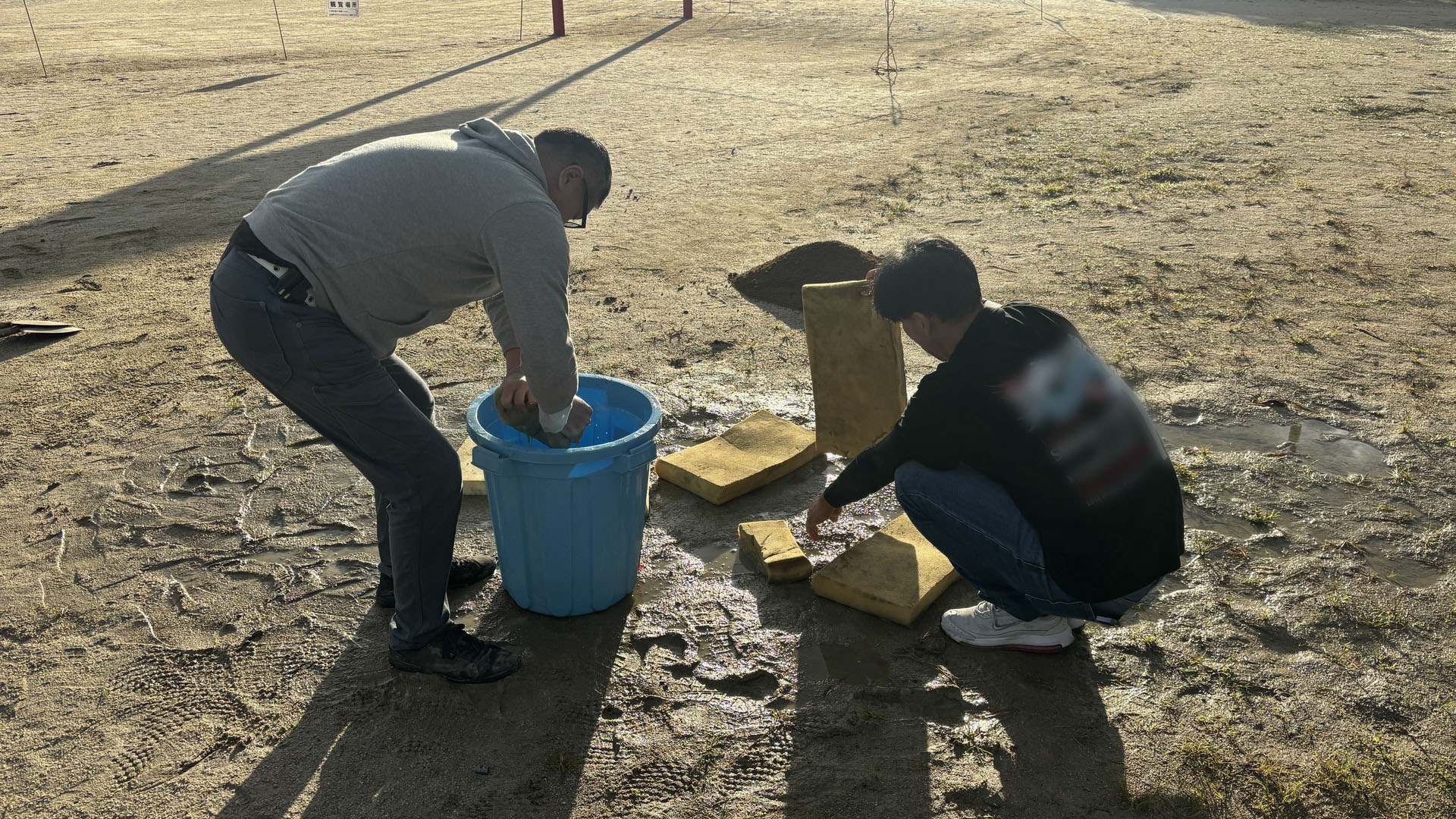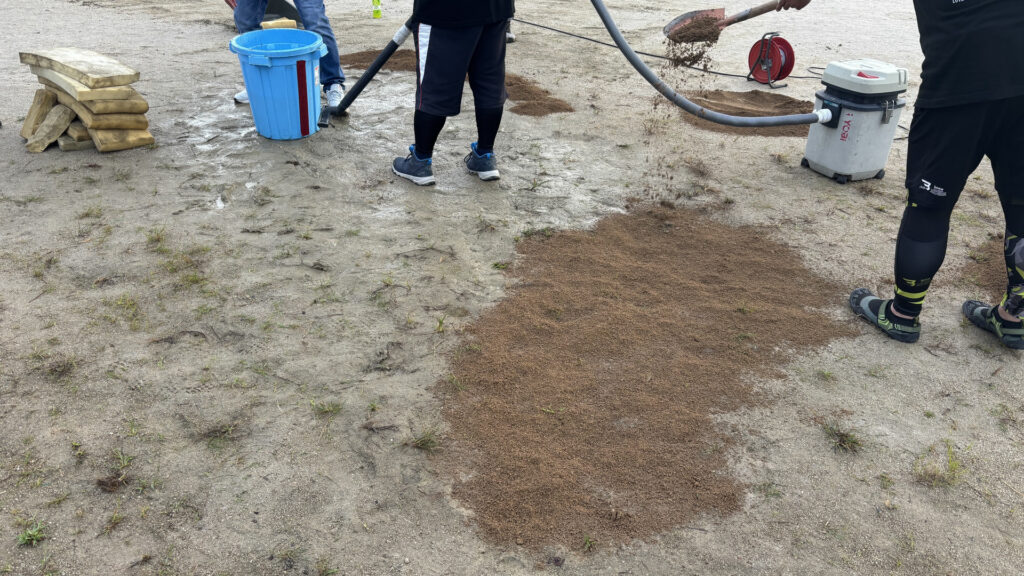 おやじの会OBとして設営のお手伝い。前日の雨でできた水溜まりの処理。