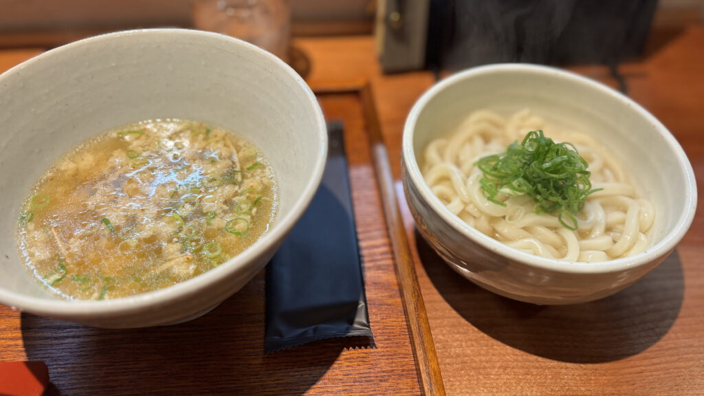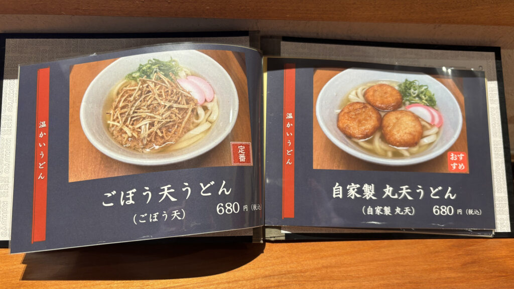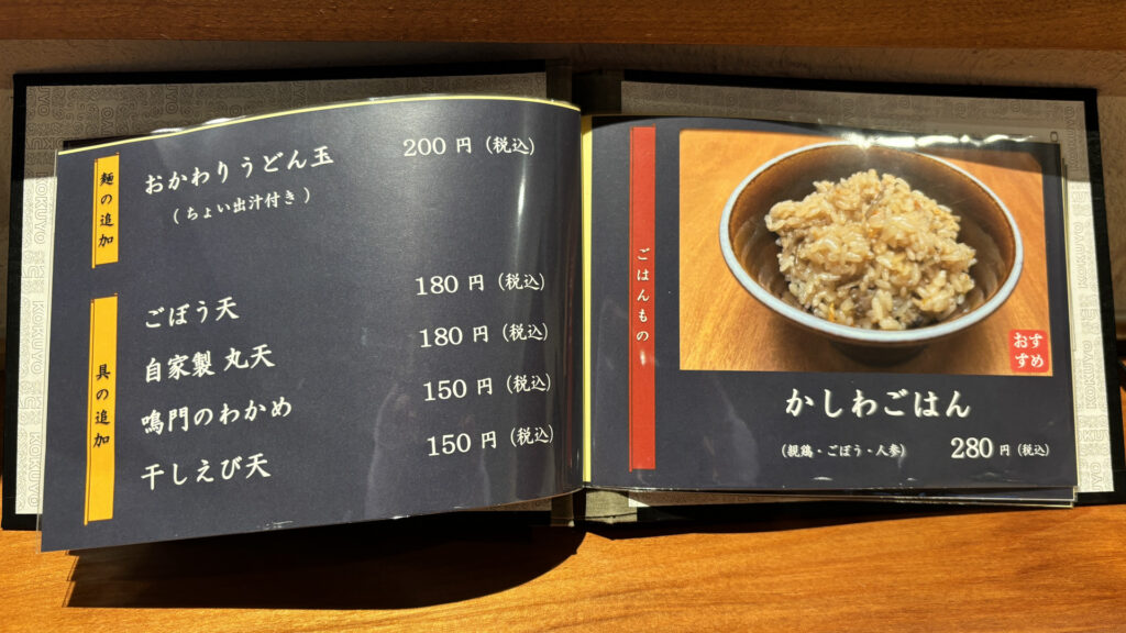 「ごぼう天うどん」680円と、「かしわごはん」280円を注文しました。うどんには珍しい替え玉、「おかわりうどん玉」があります。