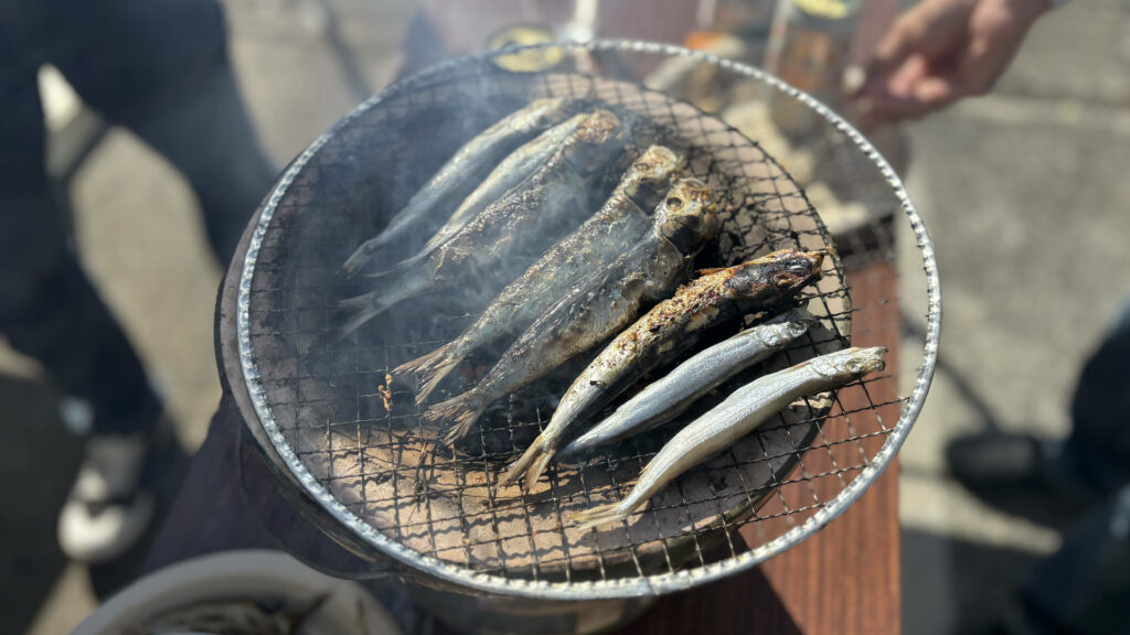 今回も田中商店で買ったさかなや天ぷらを炭火で焼いて、美味しくいただきました。