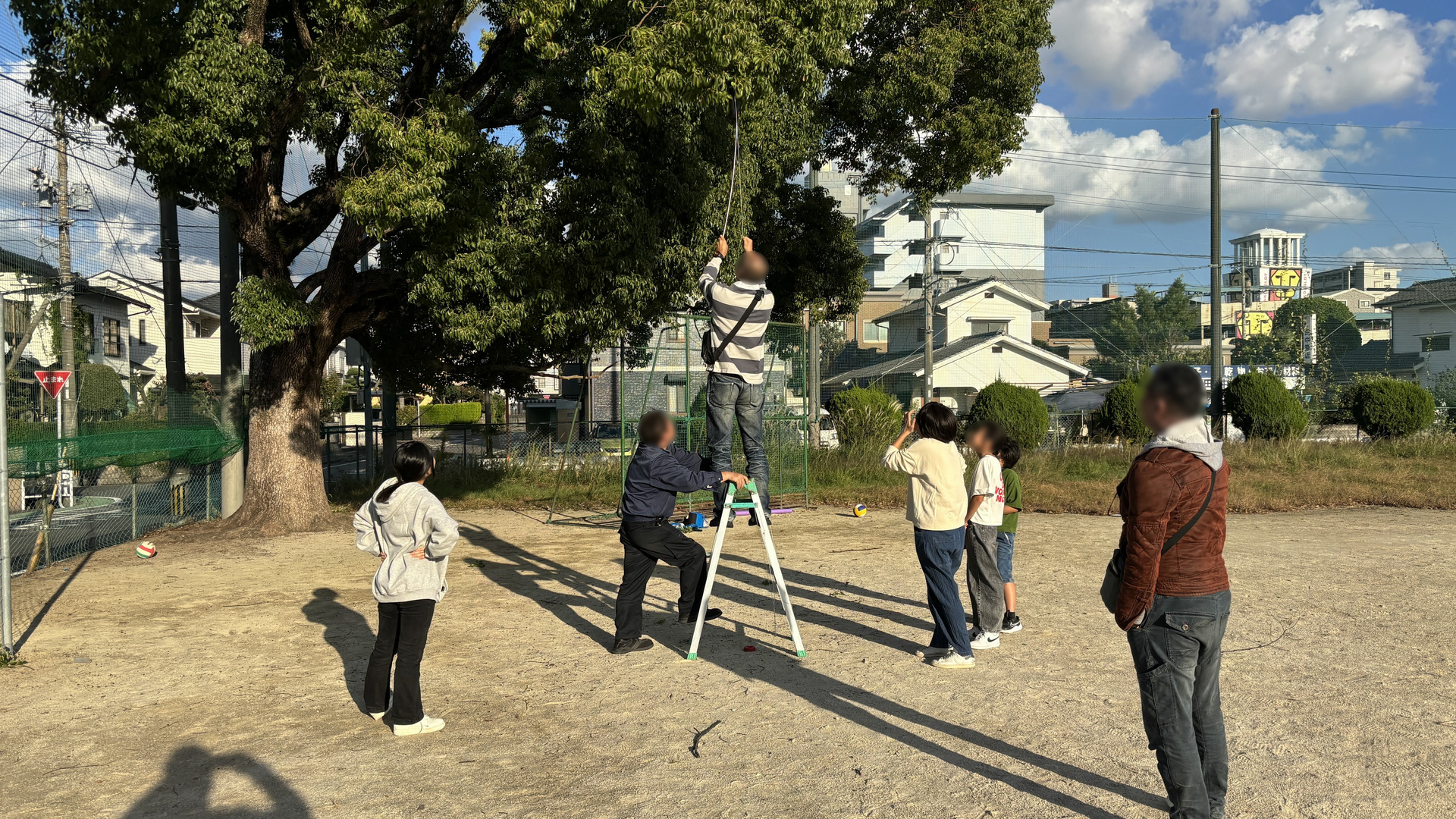 帰るとき、公園の木に紐付きボールが引っかかった家族に遭遇。お母さんが一生懸命取ろうとされてたので、手伝いました。紐が枝に絡まっていてなかなか取れませんでしたが、仲間の車に載ってた清掃道具を使って無事に取ることができました。