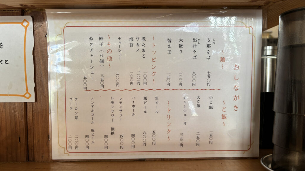 あとで気づきましたが、入口の張り紙に「ランチセット」が書いてあり、支那そばとライスのセットがお得な価格であるようでした。