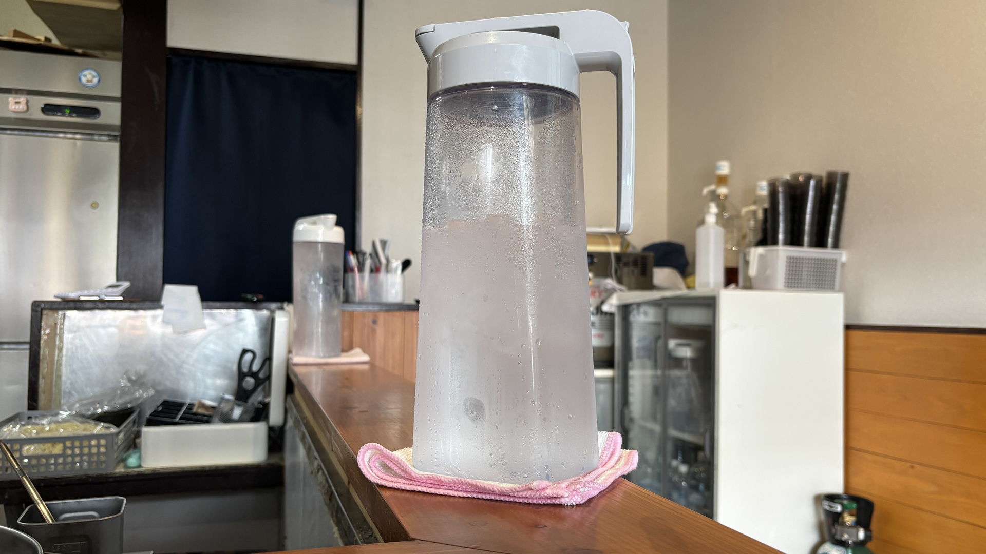 カウンター数カ所ににピッチャーとコップが置いてあります。