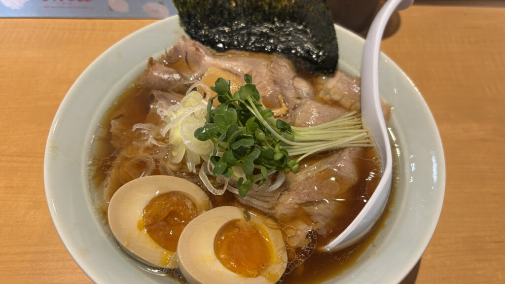 食券ではなく店員さんに注文するスタイルです。「支那そば」か「出汁そば」か迷いましたが、はじめてなので「支那そば」にして、「煮たまご」をトッピングしました。