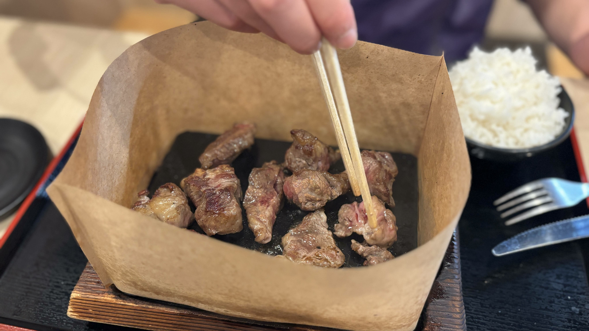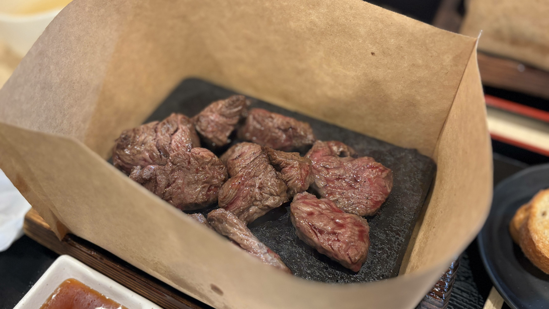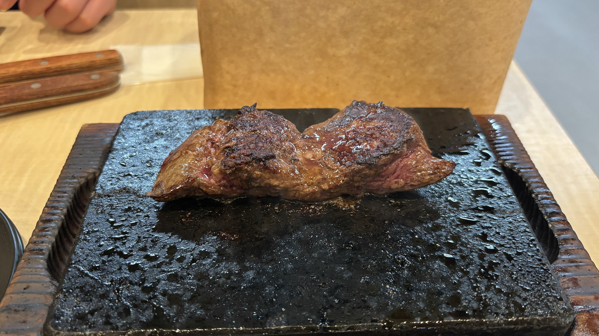 呼び出しベルが鳴り、ステーキを受け取りに行きます。
