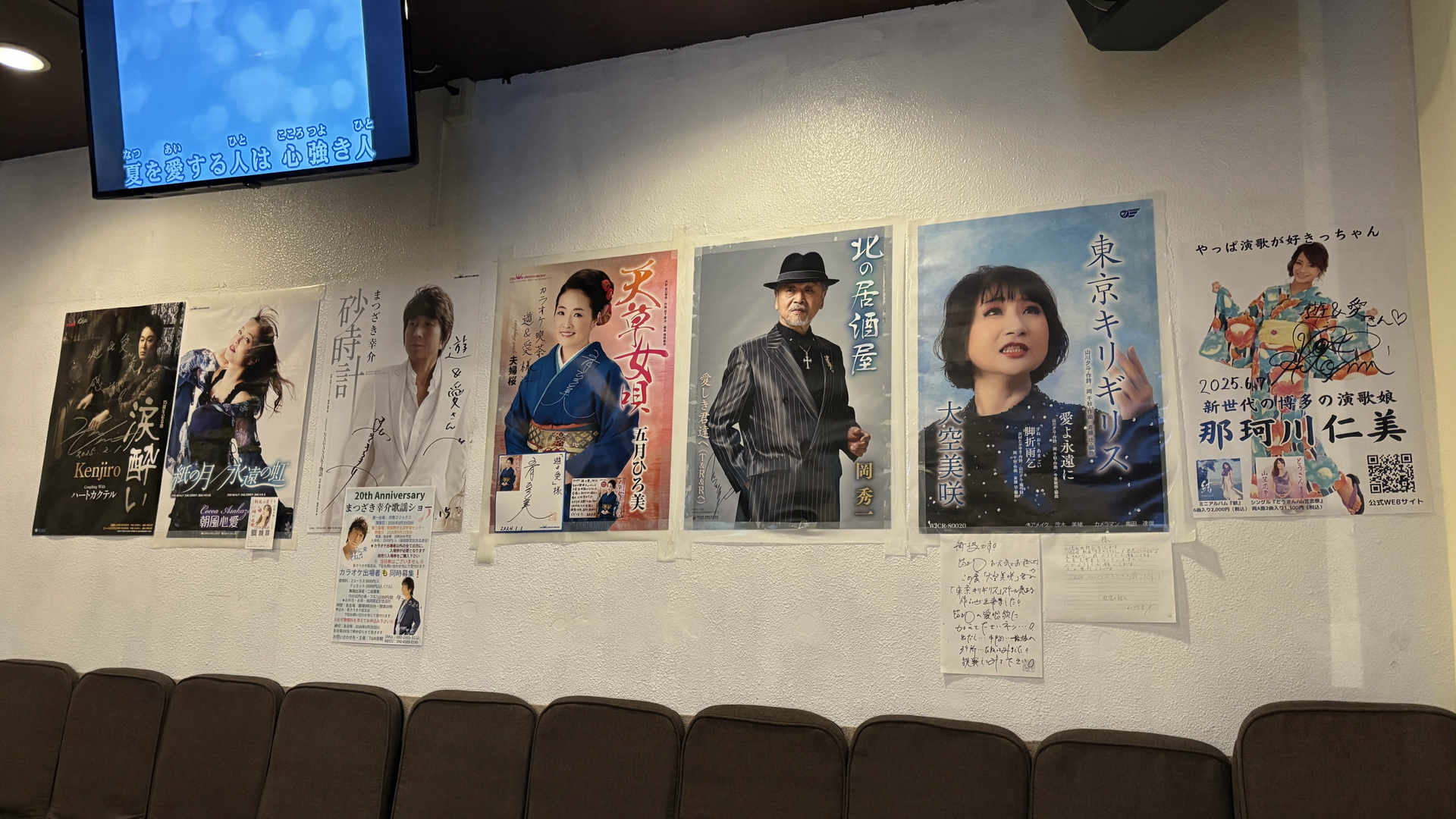 壁には歌手のサイン入りポスターが。いちばん右は我が那珂川市の演歌歌手、那珂川仁美さんです。うちの公民館の秋まつりでも歌っていただいたことがあります。