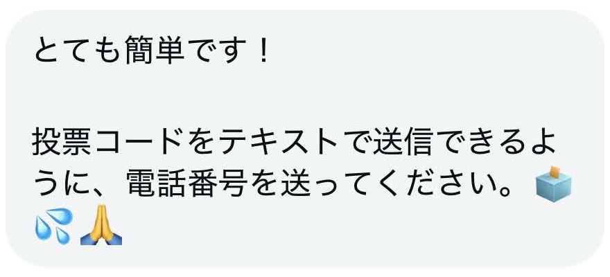 電話番号を教えると、SMSで認証コードが届きます。「投票コード」ではなくWhatsAppの「認証コード」です。