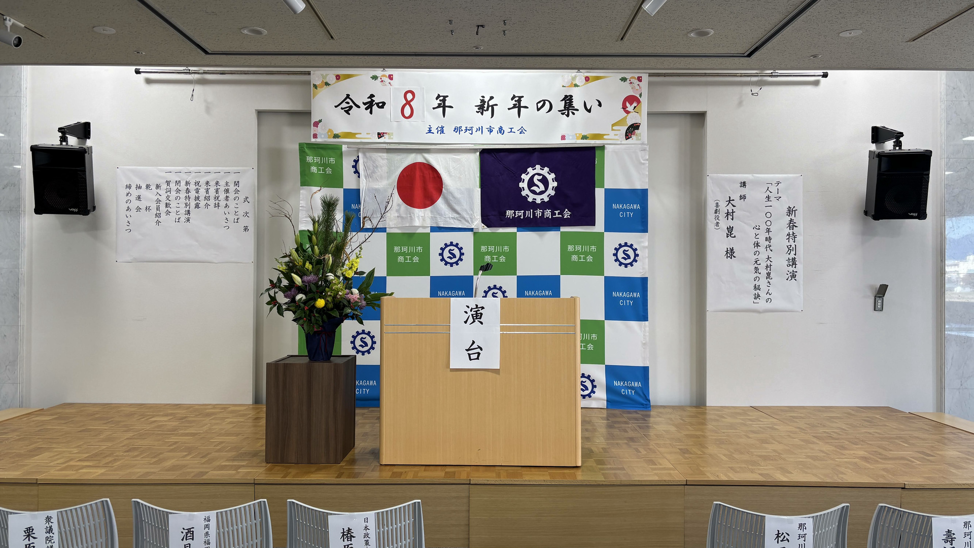 15時から商工会の新年の集い。久しぶりにスーツを着ました。私たち理事は14時集合で準備。お酒が出るので、2回目のAIオンデマンドバス「のるーと」で行きました。