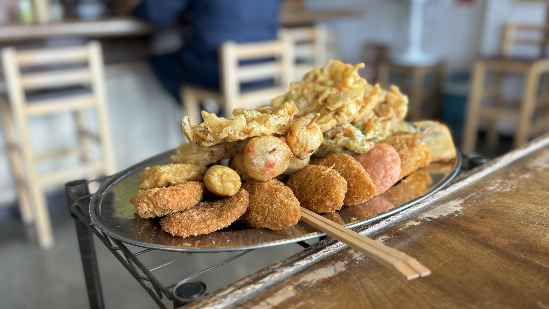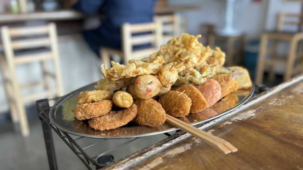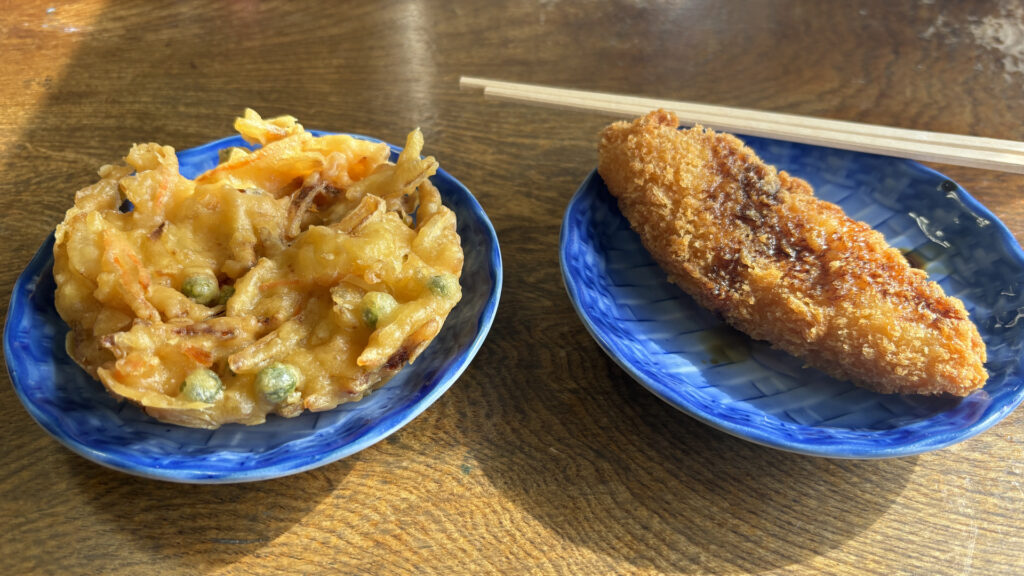 大皿から天ぷらを取ります。今回はうどんにトッピングするための「かき揚げ」と、「白身フライ」にしました。うどんが来るまで、白身フライにソースをかけて食べて待ちます。