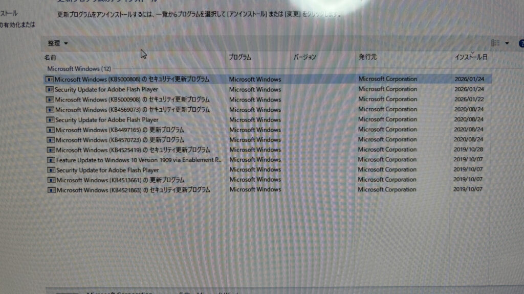 ブルースクリーンのエラーを調べると、マイクロソフトの更新プログラムで京セラ等のプリンターに印刷できなくなる不具合を起こしていることがわかりました。更新プログラムの履歴を確認してみると、前日に該当する更新プログラムが入っていました。