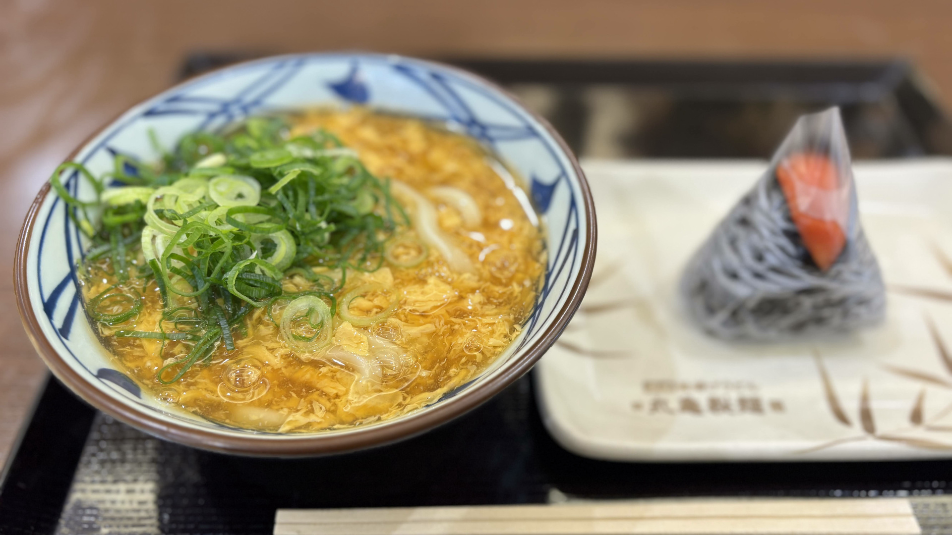 丸亀製麺で「玉子あんかけ」570円と、「明太子おむずび」170円にしました。