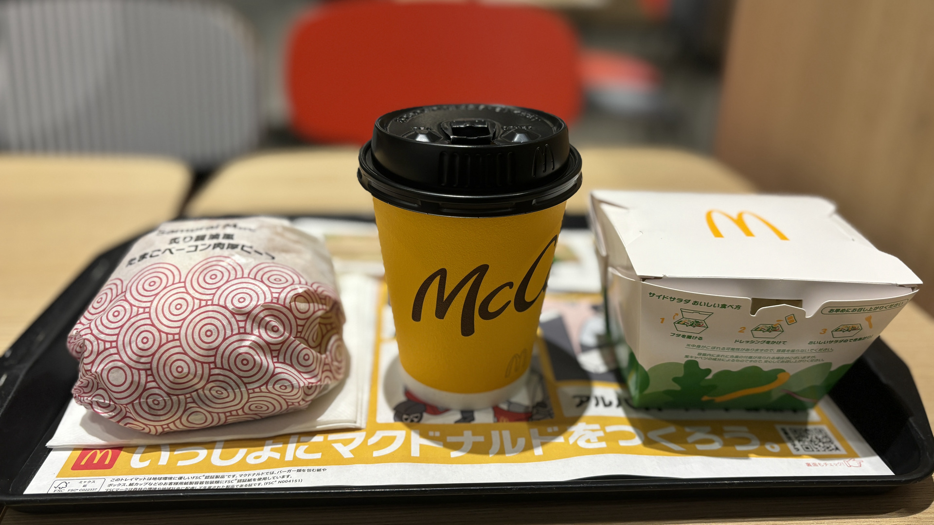 夕食に「炙り醤油風 たまごベーコン肉厚ビーフ セット」をモバイルオーダーして席まで持ってきてもらいました。サイドはサラダです。パピヨンガーデンのマックより人が少なくて、ゆっくりできます。