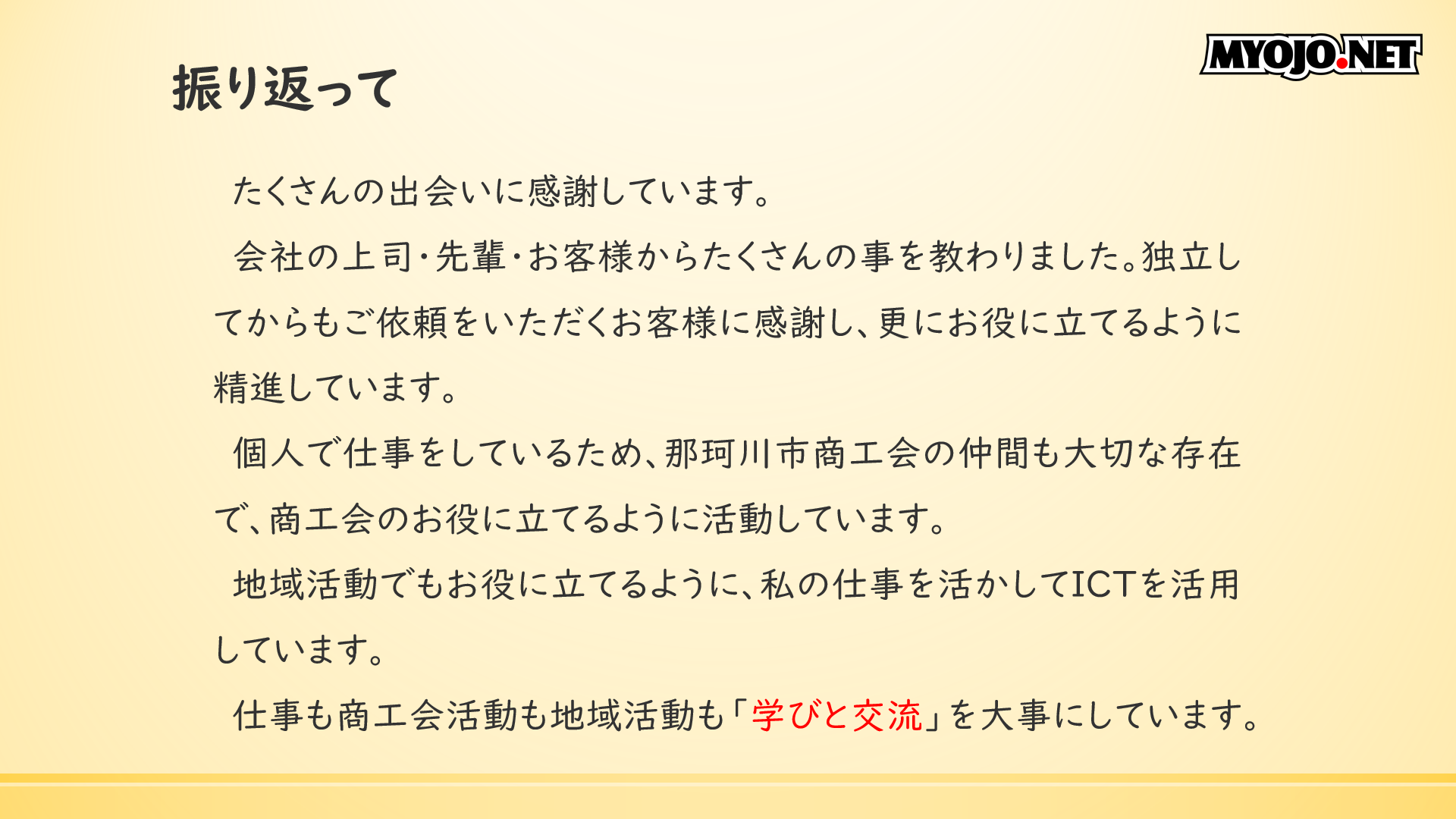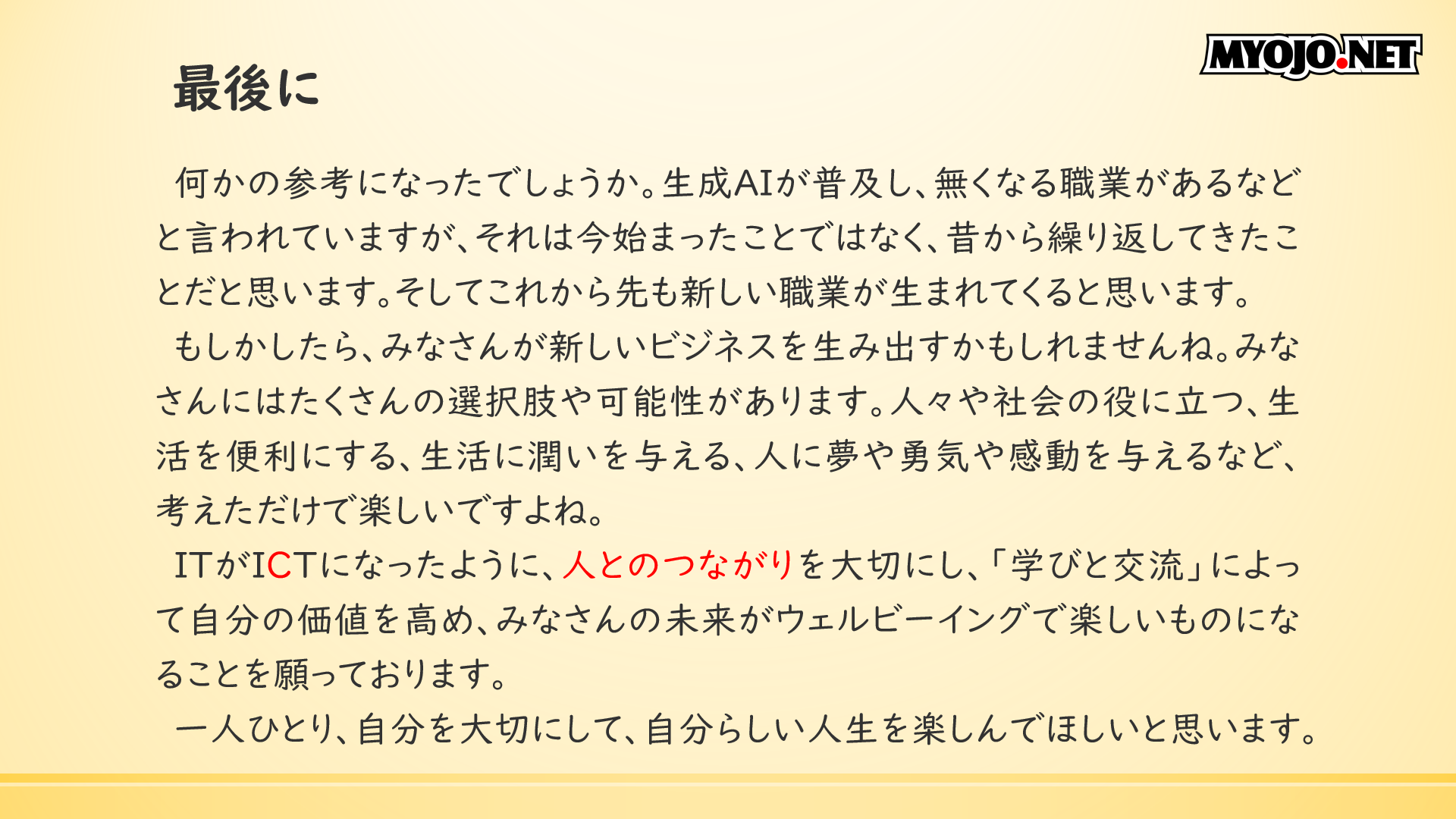 今回このような機会をいただき、資料を作りながら自分を振り返る良い時間になりました。職業講話、楽しかった。また機会があれば、他の学校でもしてみたいな。
