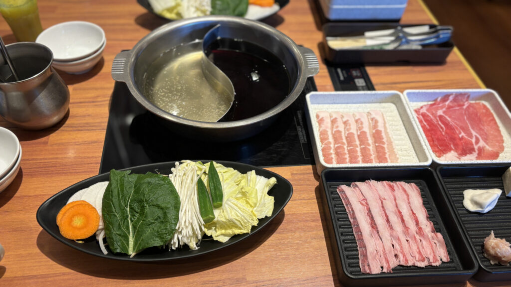 間を取って?「MKレストラン」にしました。「彩り野菜のお手軽鍋ランチ」1,000円でお腹一杯になります。選べるスープは「MKオリジナルスープ」と「すきやきスープ」にしてみました。白ご飯、バミー麺、うどんが選べますが、+50円の雑炊にしました。350円のMKカフェ(ソフトドリンクとソフトクリーム)も付けました。