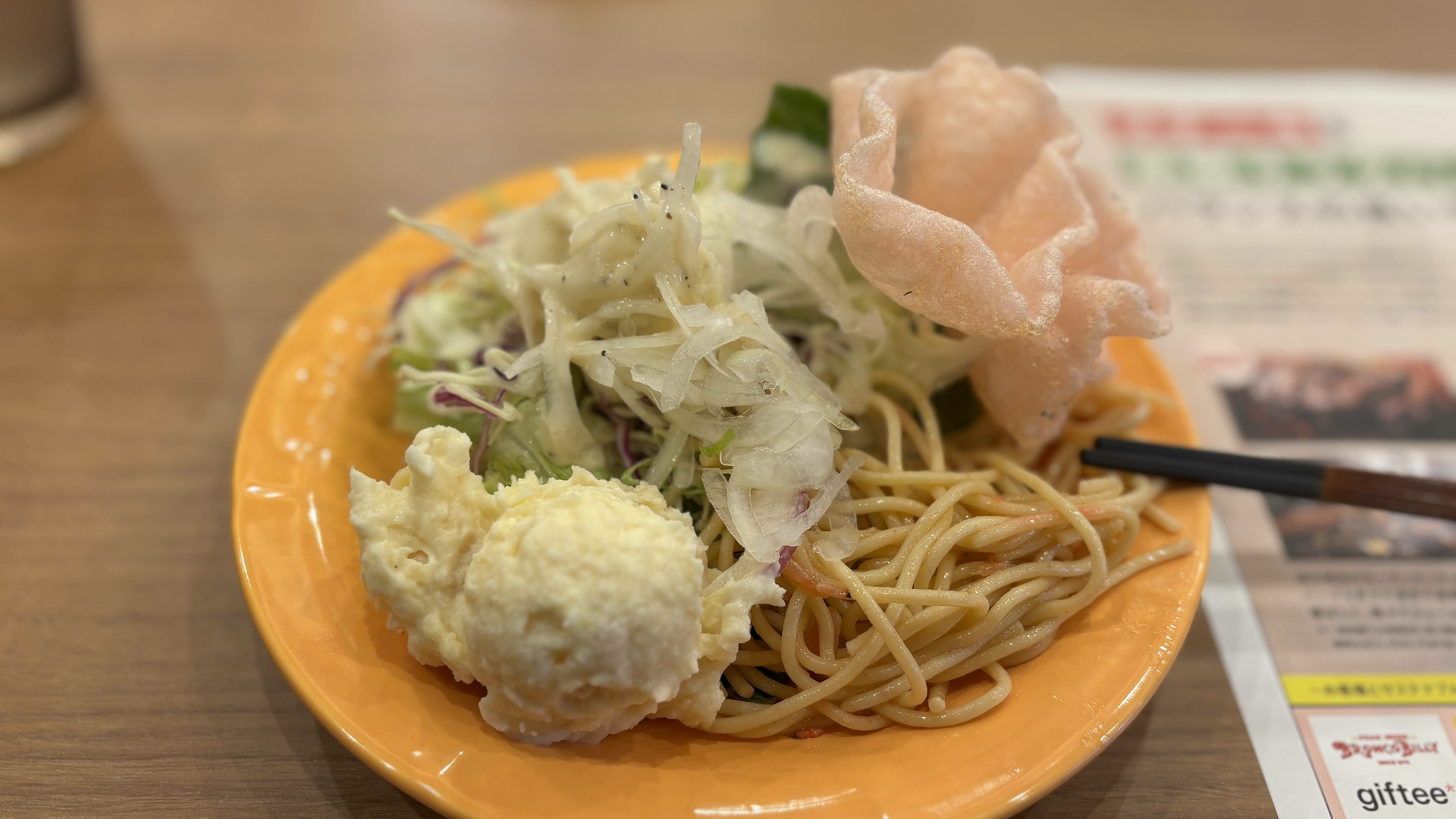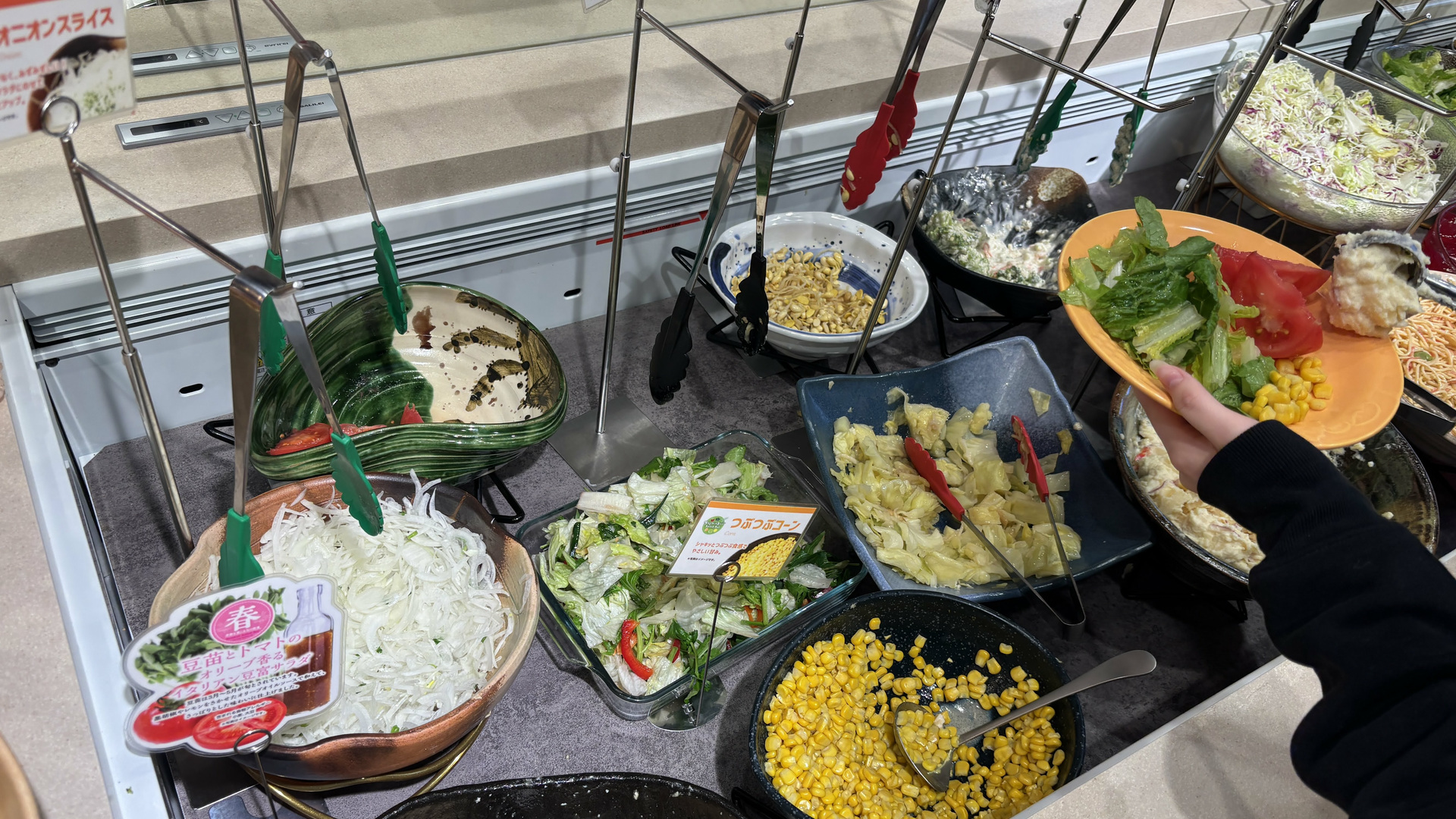 サラダバーにはパスタやゼリーやカステラもありました。ドレッシングは5種類。
