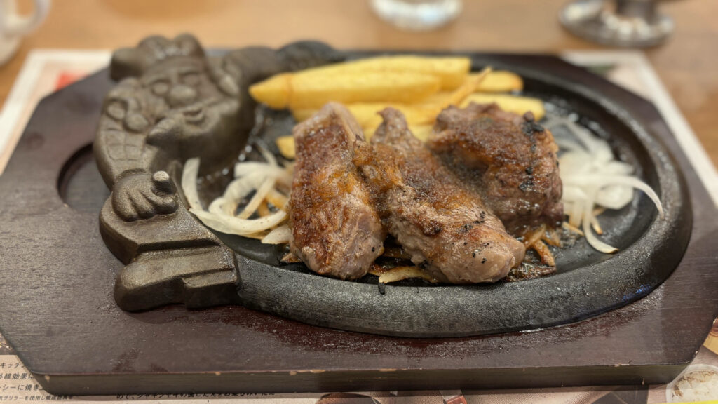 ステーキはこんな感じ。まぁまぁ柔らかく、ソースと塩で美味しくいただきました。