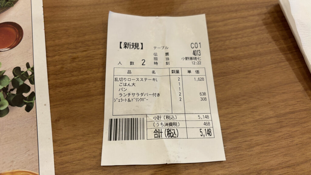 二人とも「炭焼き乱切りロースステーキランチ」1,628円に、サラダバー638円とジェラート&ドリンクバー308円を付けました。ランチのセットは、娘はパン、私はごはん大盛りを選択。