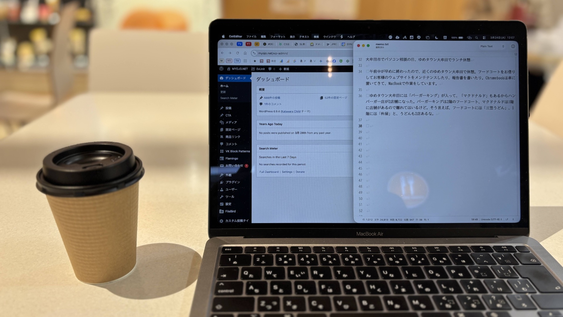 フードコートをお借りしてお客様のウェブサイトをメンテナンスしたり、報告書を書いたり。Chromebookは車に置いてきて、MacBookで作業をしています。