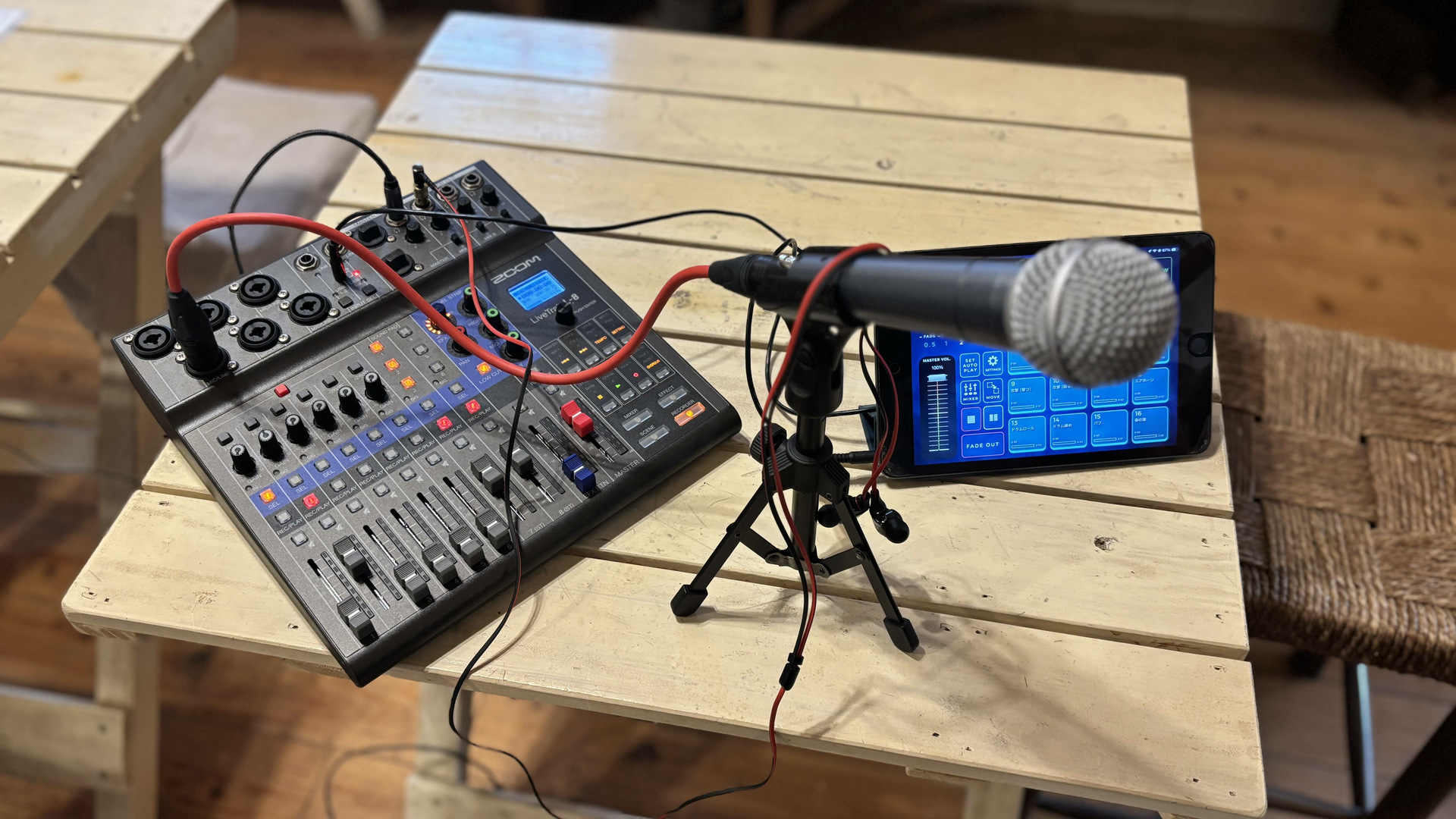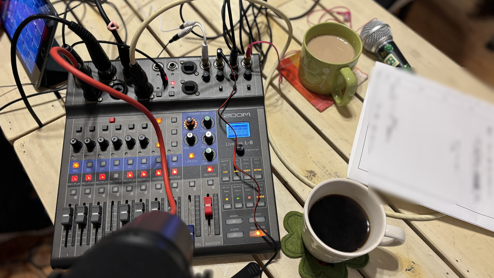 最初は博多南駅前ビル指定管理事業者の機材で収録していましたが、コロナ禍を機にZOOM社のオーディオインターフェイス・デジタルミキサー LiveTrak L-8を購入して収録に使っています。