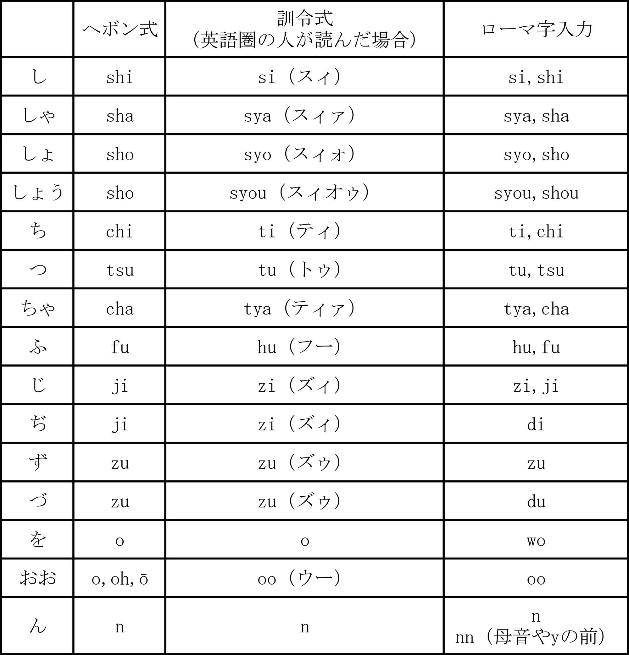 ヘボン式の表記と、ローマ字入力を比較すると