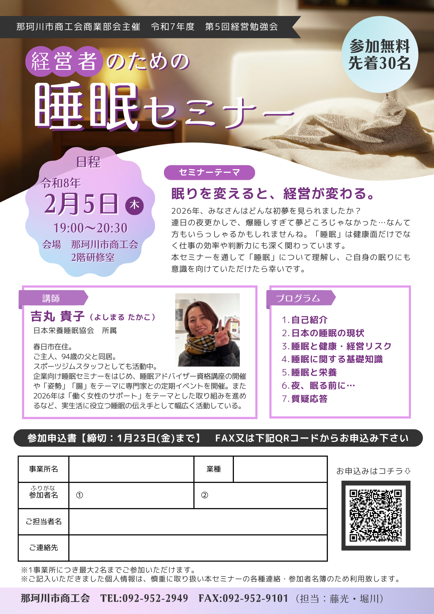 当部会では、皆様の経営にお役立ていただけるよう、無料セミナー開催を計画しています。商工会会員でなくても、個人でも、どなたでもご参加いただけますので、お気軽にお申し込みください。 第5弾として「経営者のための睡眠セミナー」を開催します。眠りを変えると、経営が変わる!!と題して、日本栄養睡眠協会の吉丸先生をお招きし、睡眠について理解をし、ご自身の眠りを変えて自社を良くしていくというセミナーです。 お申し込みはこちら Info 日付:2026年2月5日(木)受付:18:30~時間:19:00~21:00場所:那珂川市商工会館 2階 会議室住所:那珂川市西隈3-1-10 メッセージを送る