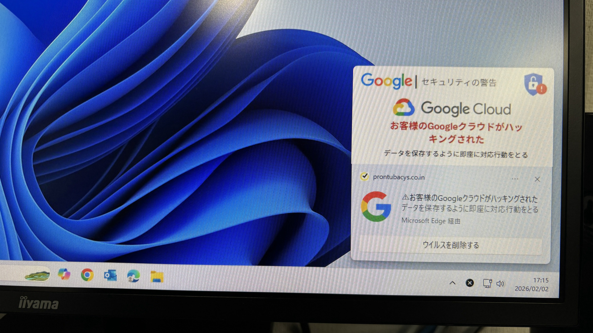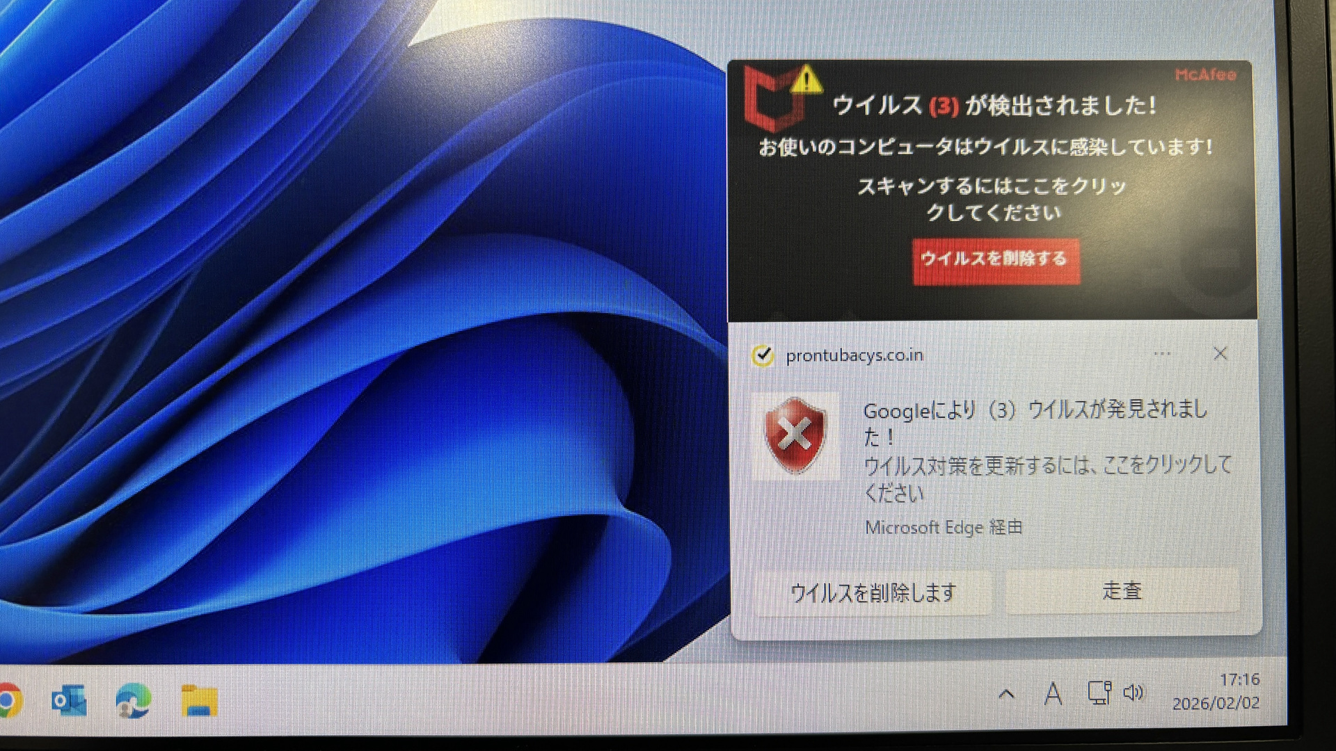 このような表示を見たという方は多いかもしれません。これはMicrosoft Edgeなどのブラウザ(ウェブサイト閲覧アプリ)の通知機能を悪用したもので、本当にウイルスに感染している訳ではありません。